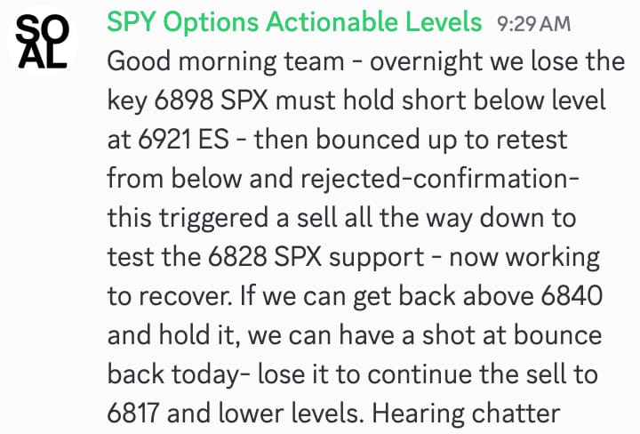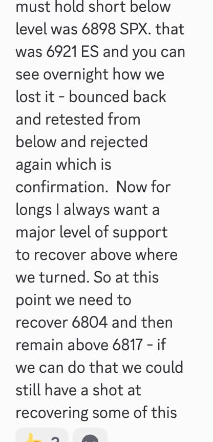 This is what happened. The market opened with a significant gap down after losing the critical 6898 level overnight. Once we broke below that key support, the selling pressure intensified, leading us down to a low of 6780. In the regular session, attempts to reclaim 6840 were unsuccessful, and we continued to slide through lower supports including 6828and consolidating into the close. $SPY ( ▲ 1.92% ) $SPX ( ▲ 1.97% ) $ES_F ( 0.0% )