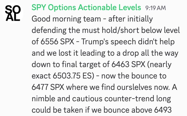This is what happened. Today’s trading session was characterized by significant volatility, reflecting the market’s reactions to external factors, including Trump’s speech. We lost the critical 6556 level overnight, which triggered a cascading drop through all our downside targets, including 6543, 6528, 6510, 6493, 6477, and 6463. Fortunately, we managed to defend these lower levels, leading to a bounce back. The recovery of 6493 allowed us to reclaim the key levels of 6556 and 6570, which propelled us towards a high of day at 6601.91, right at our 6600 target. $SPY ( ▲ 0.09% ) $SPX ( ▲ 0.11% ) $ES_F ( ▲ 0.07% )