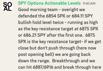 This is what happened. We successfully defended the key 6854 level overnight, which set the stage for an upward move. After a solid push through 6875, we reached a high of 6895.78 in the morning before encountering resistance and ultimately rejecting back below 6875. For the remainder of the day, we saw some choppy trading, consistently rejecting off the 6875 mark from below and 6854 from above. $SPY ( ▲ 0.19% ) $SPX ( ▲ 0.19% ) $ES_F ( 0.0% )