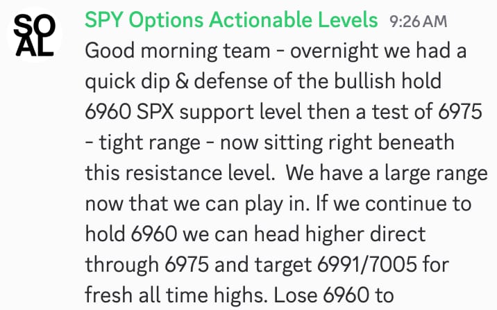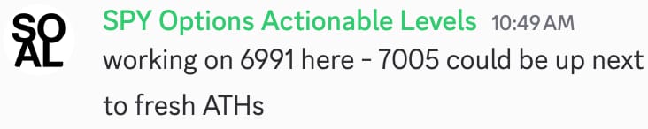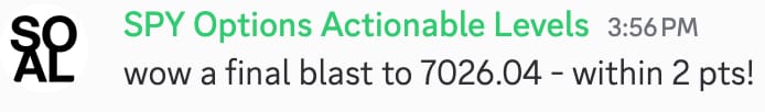 This is what happened. Today’s trading was guided by our carefully identified levels. The defense of the 6960 SPX support overnight proved crucial, allowing us to hold a tight range below the 6975 resistance. This setup led to a strong post-open session where we swiftly moved through the 6991 level and ultimately broke through 7005, marking fresh all-time highs with a high of day reaching 7026.24, just shy of our 7028 upside target. $SPY ( ▲ 0.81% ) $SPX ( ▲ 0.8% ) $ES_F ( ▲ 0.75% )
