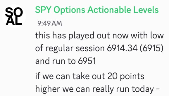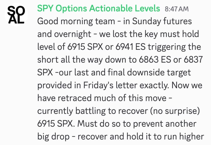 This is what happened. The levels we monitored played out perfectly today. In Sunday futures we had a significant dip, losing the key 6915 SPX level overnight. This triggered the sell, leading to a swift drop down to our target of 6837 SPX, precisely hitting our downside mark (6864.5 ES). As we approached the regular session, the market showed resilience. We defended the 6915 level with strength, and from there, we initiated a powerful rally that pushed us up through the key resistance target of 6970, reaching a high of 6991, just above our 6984 target. $SPY ( ▲ 0.5% ) $SPX ( ▲ 0.54% ) $ES_F ( 0.0% )