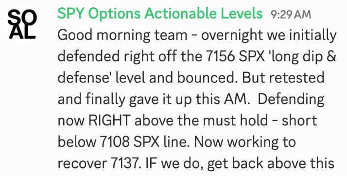This is what happened. Overnight we dropped to the 7156 SPX support, where buyers stepped in, but soon after, we fell back and had to defend the critical 7108 support level. After holding this pivotal area, the market rallied back. In the regular session we chopped and defended lower supports again but led to a slow grind to recover 7121 and 7137 into the close. $SPY ( ▼ 0.49% ) $SPX ( ▼ 0.49% ) $ES_F ( ▼ 0.47% )